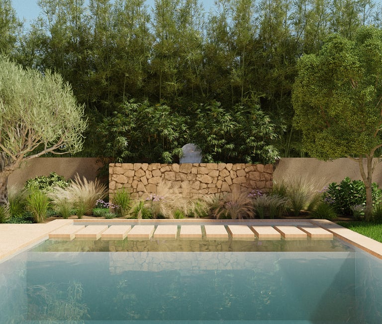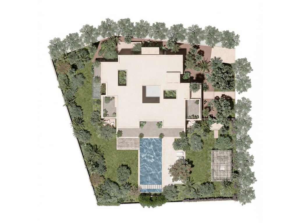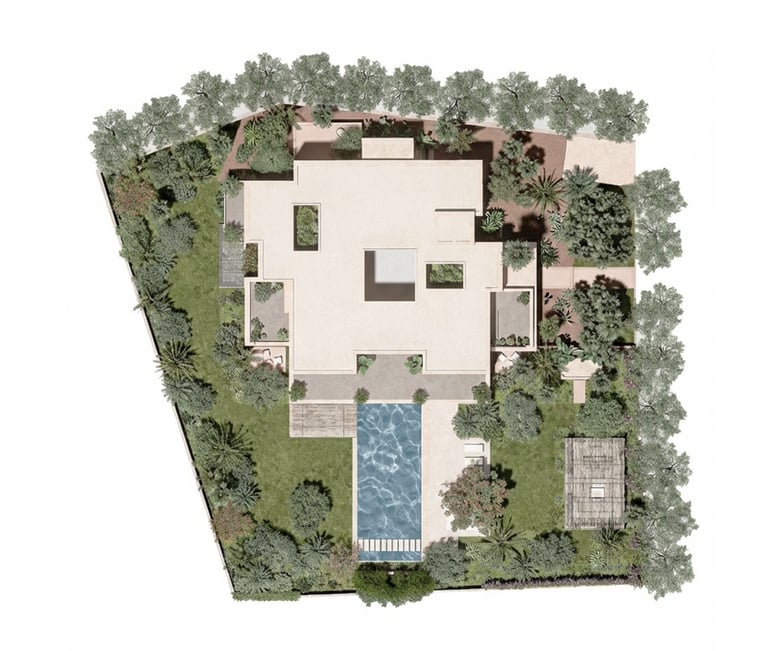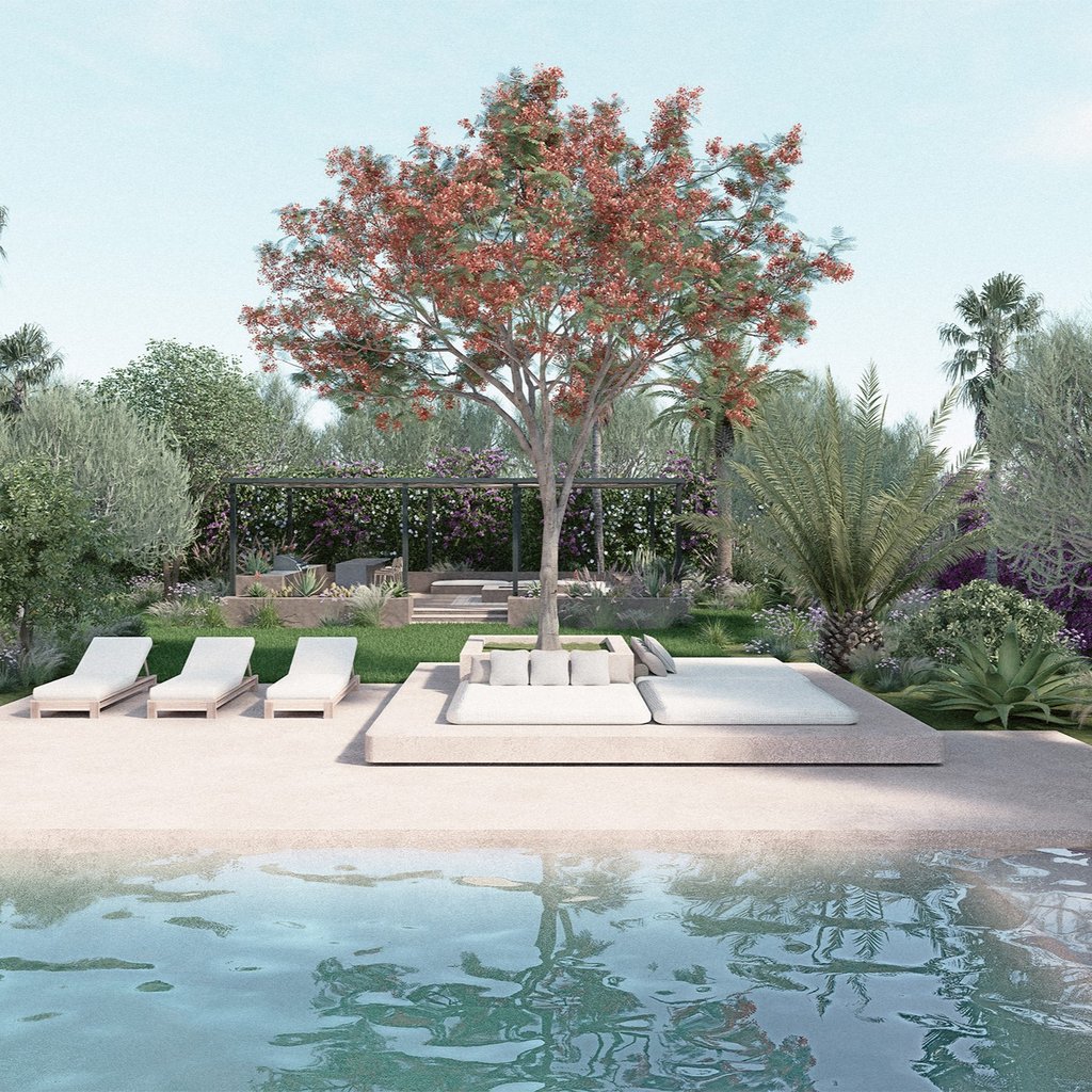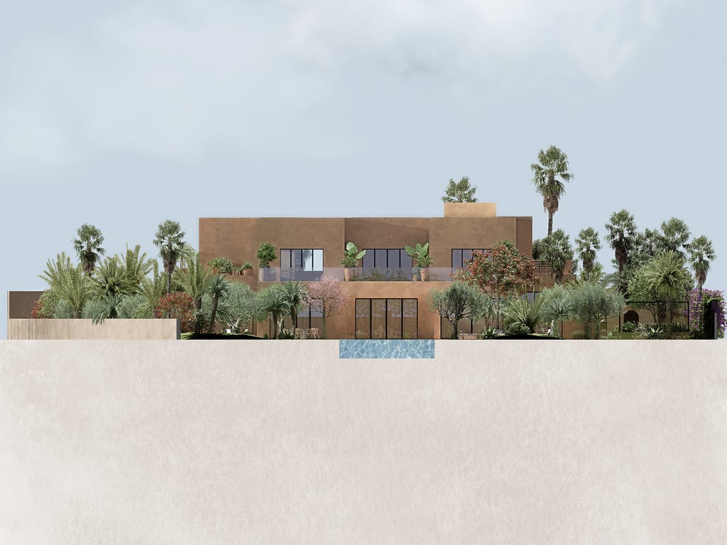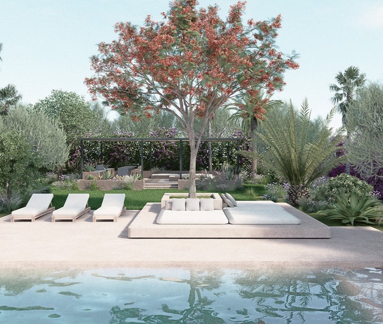 La palette végétale associe arbres remarquables, palmiers majestueux et plantations adaptées au climat marocain, créant un équilibre entre fraîcheur, ombrage et sobriété hydrique. Le dialogue entre végétation luxuriante et espaces de jardin sec méditerranéen permet d’alterner densité végétale et respiration minérale, renforçant la lecture architecturale du lieu. Les matériaux nobles, pierre naturelle, revêtements minéraux, textures brutes et finitions haut de gamme, structurent les perspectives et valorisent chaque scène paysagère.